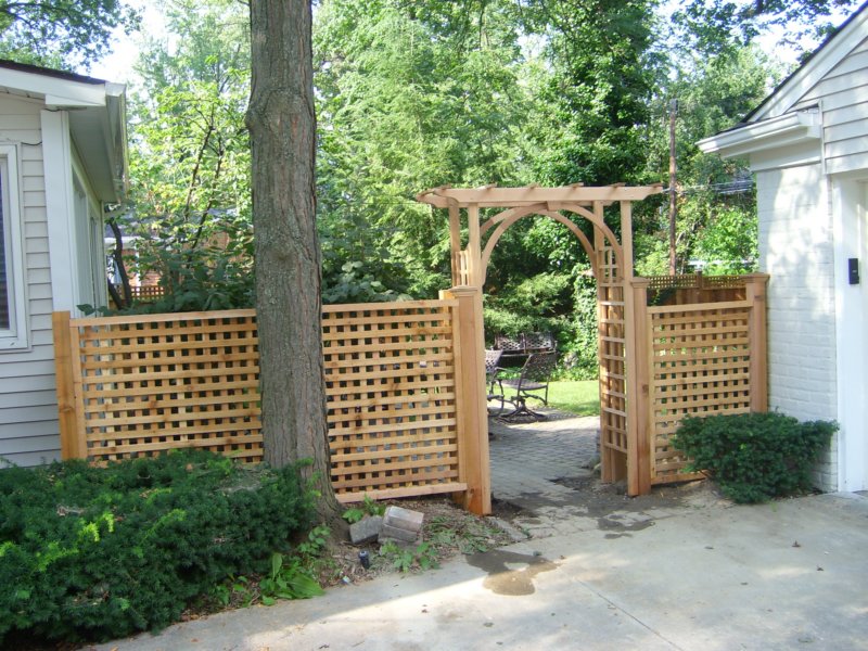 Back of "Routed Rail" wood fence shown with transition from 4'-6'